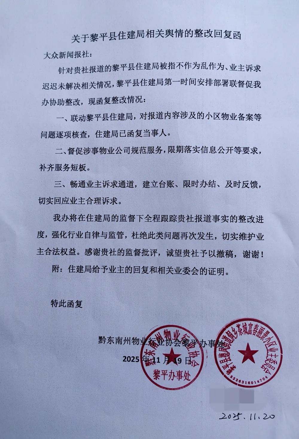 2025年11月19日,一家自称黎平县住建局下属单位的“黔东南州物业行业协会黎平办事处”要求撤稿,并加盖有富春丽景小区业主委员会印章。除来函要求撤稿外,记者还接到行业熟人的电话要求处理稿子。