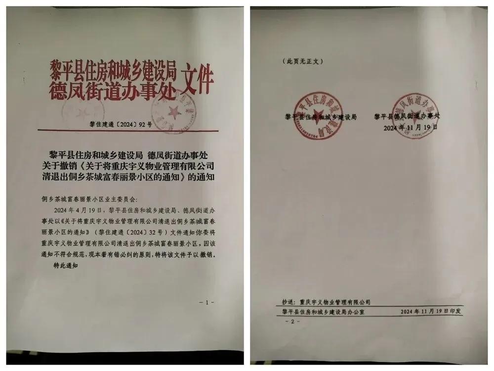 2024年11月19日,黎平县住建局、黎平县德凤街道办事处又联合认为要求业委会清退新物业公司行政行为不符合规范,予以撤销。