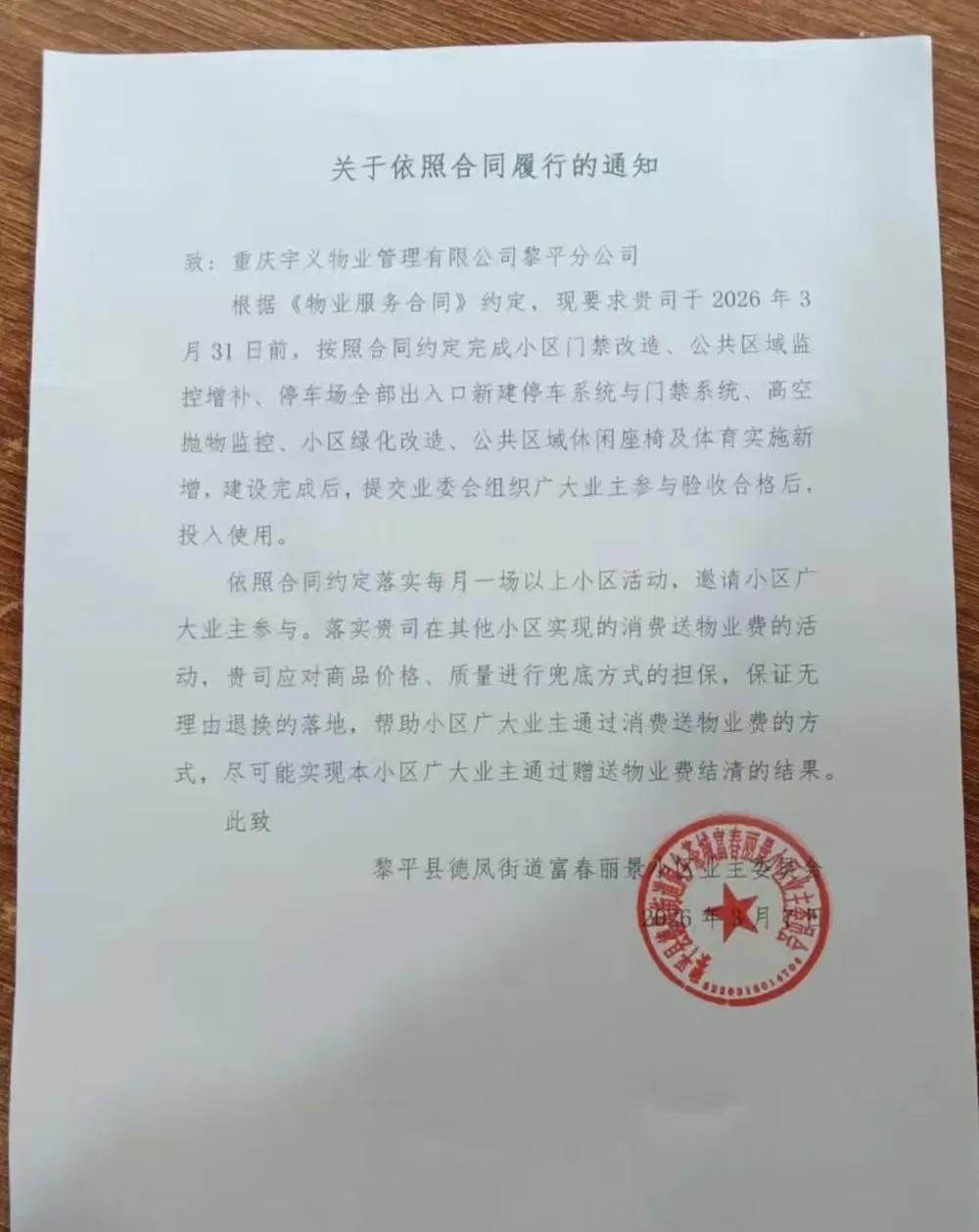 2026年3月7日,富春丽景小区业委会通知新物业,要求按照物业合同完成对小区门禁改造、公共区域监控增补、停车场出入口系统、高空抛物、小区绿化等设施设备投资建设且保证在2026年3月31日前完工并通过业主验收。