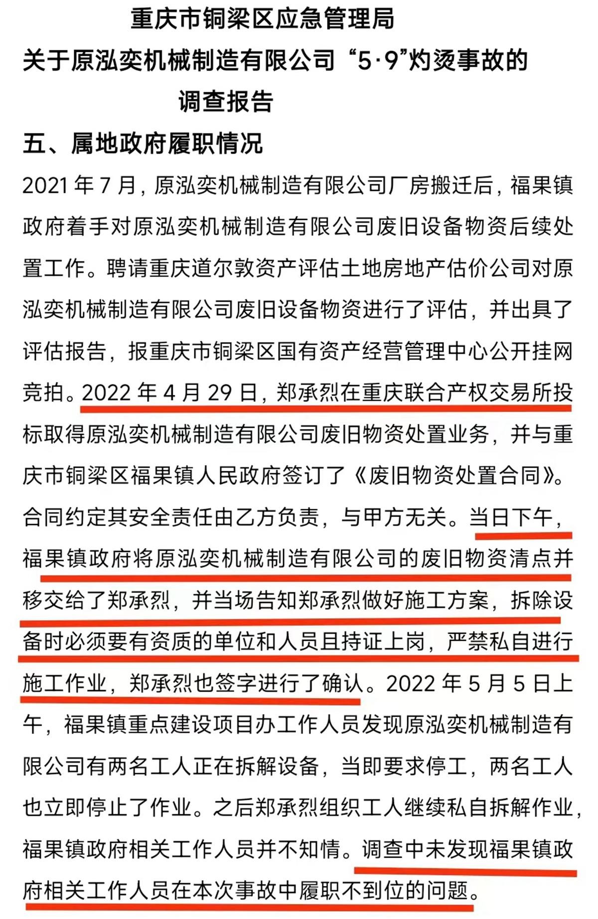 2022年5月9日,重庆铜梁区发生一起煤粉罐燃爆造成一死一重伤的重大事故,当地应急部门调查后上报区政府认定事故是以中标业主郑承烈“雇佣未取得特种作业(熔化焊接与热切割作业)资格的工人陈有志和陈国强违规冒险拆解焊割废旧煤粉储罐作业时,引燃煤粉并外泄发生燃爆事故”,并认定郑承烈承担安全责任事故全部责任,同时移交公安机关,追究其刑事责任。而被认为承担事故责任的业主郑承烈投诉认为,应急部门在事故调查过程中存在多处程序违法,并且伪造证据,将本应由当地福果镇政府承担安全监管不履职的责任,强加于他身上造成他倾家荡产,已经赔偿了上百万的民事赔偿款,还要面临承担重大责任事故罪的刑事责任风险。