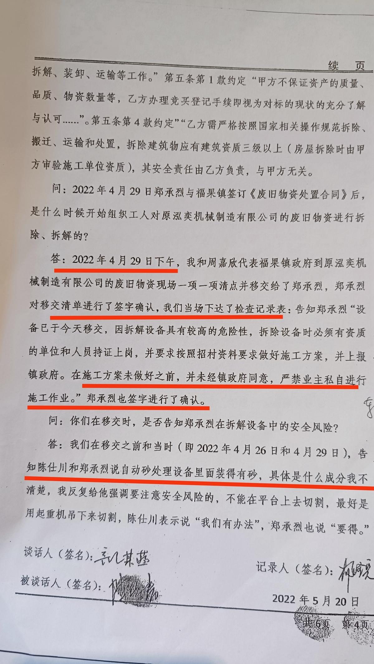 投诉业主郑承烈还告诉记者:他表示应急部门的这种调查处理意见,就是对案件调查马虎极不负责的态度,对福果镇政府安全责任监管工作人员伪造危险物品移交通知以及停工通知的证据没有采取严谨科学的态度进行鉴定,而是采取了包庇纵容福果镇相关安全工作人员不履职的监管责任,整个事故责任强加于自己,这就是一个栽赃陷害的行为。事故发后电话向应急局段副局长反映情况,段副局长明确告知此事他不是生产型企业是废品回收个人,不属于应急局的管辖范围,而现在却要追究行政和刑事责任。如果区安监局和区政府不纠正这种错误的做法将投诉到底。目前他已经卖房卖车赔了上百万的死者民事赔偿款,伤者的民事赔偿还有上百万他已经无力赔偿。明明是当地政府对危险物品没有尽到告知的责任,还要伪造证据,将赔偿责任强加于他。这样漏洞百出的事故处理结果,虽然法院要违背事实真相进行了确认正确,但他永远不服。