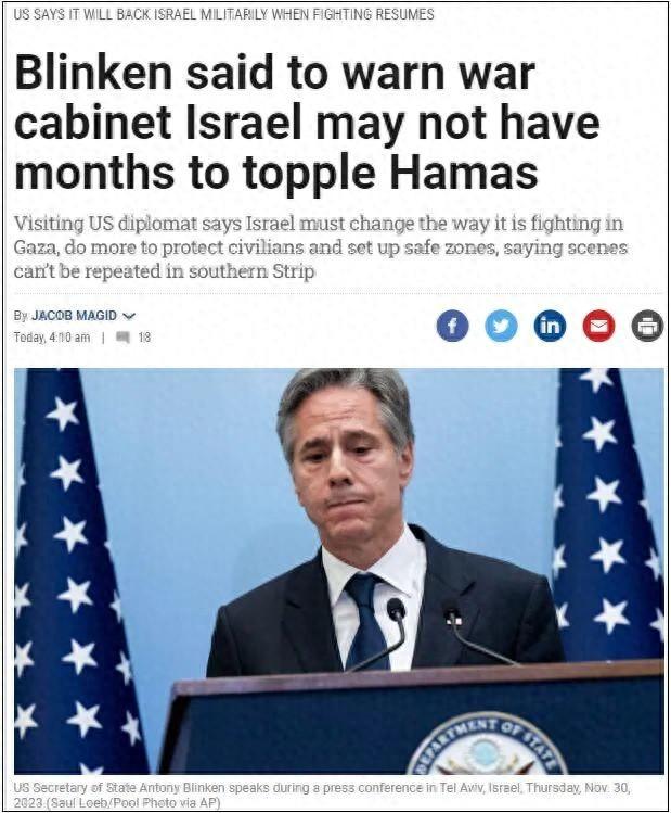 据以媒爆料,当地时间11月30日,自新一轮巴以冲突爆发以来第四次到访以色列的美国国务卿布林肯当天在内部会议中警告以色列,采取军事行动的时间已经不多了。