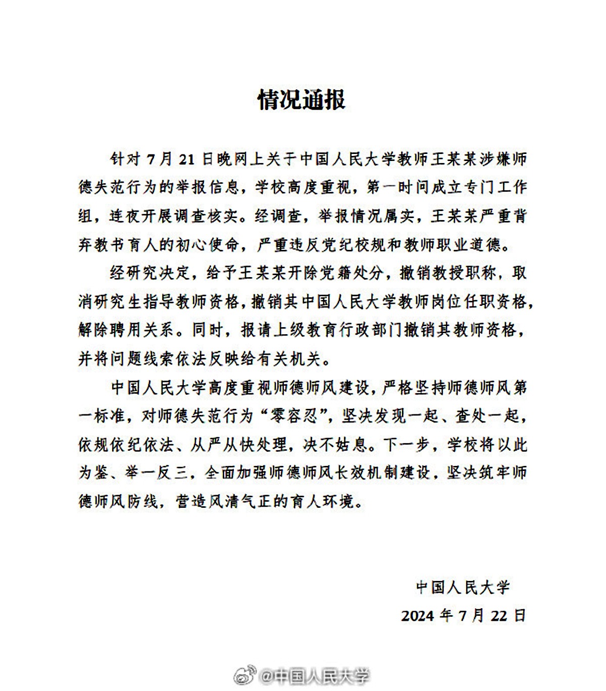 次日的7月22日下午19点零4分,中国人民大学官方微博发布相关情况通报。通报称:针对7月21日晚上网上关于中国人民大学教师王某某涉嫌师德失范行为的举报信息,学校高度重视,第一时间成立专门工作组,连夜开展调查核实。经调查,举报情况属实,王某某严重背弃教书育人的初心使命,严重违反党纪校规和教师职业道德。