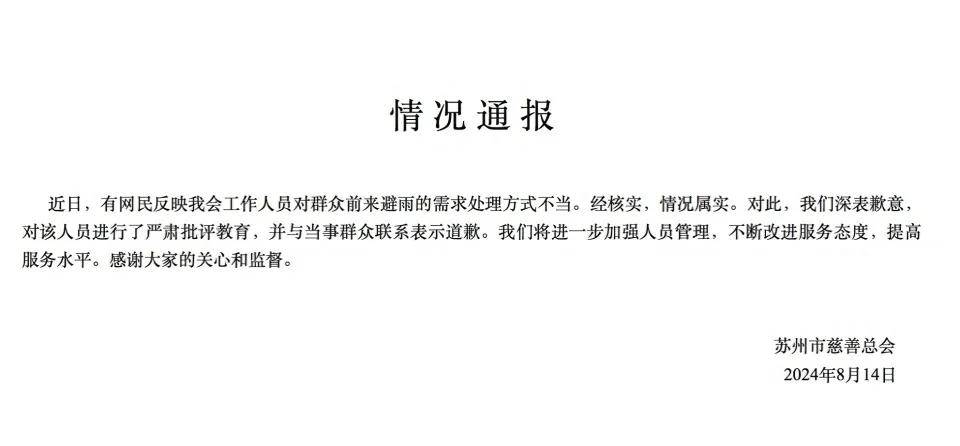 大众新闻报注意到,8月14日,苏州市慈善总会发布情况通报,情况通报称:近日,有网民反映我会工作人员对群众前来避雨的需求处理方式不当。经核实,情况属实。对此,我们深表歉意,对该人员进行了严肃批评教育,并与当事群众联系表示道歉。我们将进一步加强人员管理,不断改进服务态度,提高服务水平。感谢大家的关心和监督。
