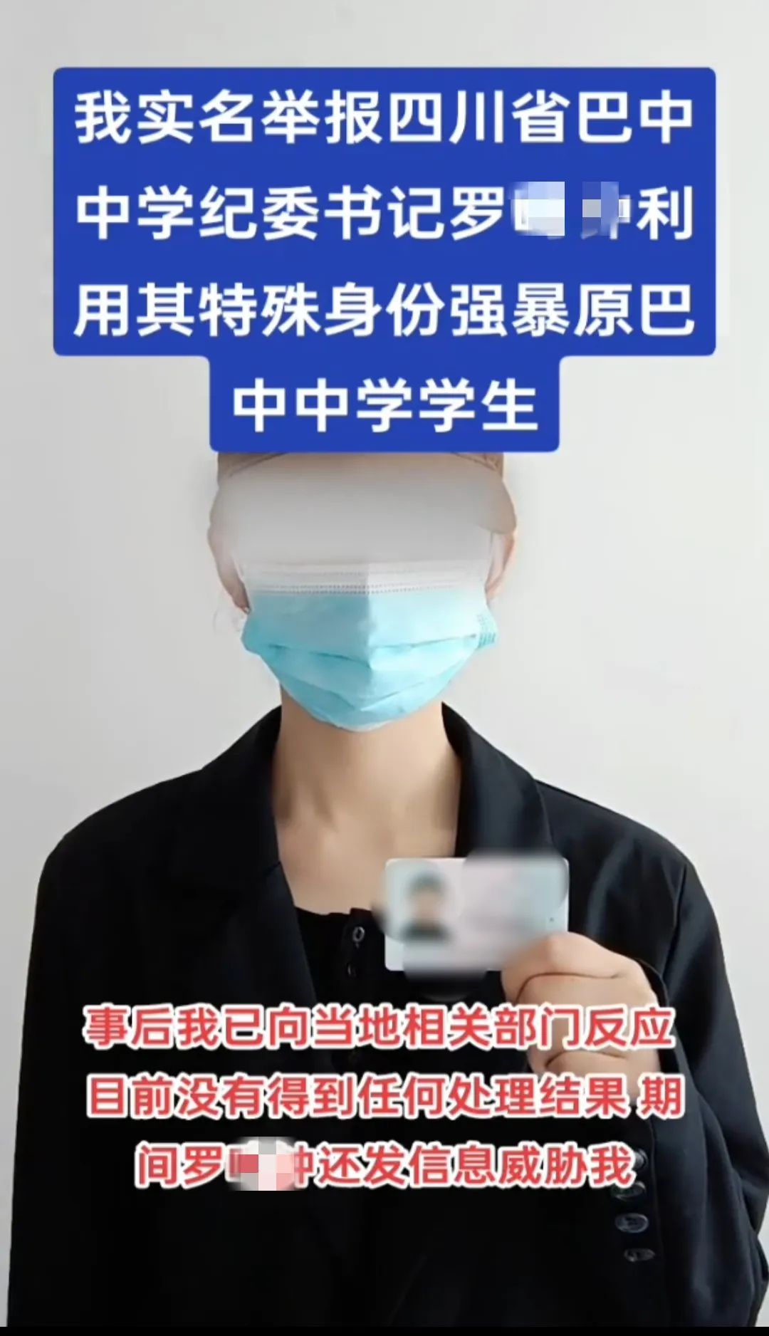 近日,网传四川巴中一女子在社交平台发布实名举报视频称:四川省巴中中学纪委书记罗某某对其实施猥亵、强暴,事后还遭到对方威胁。